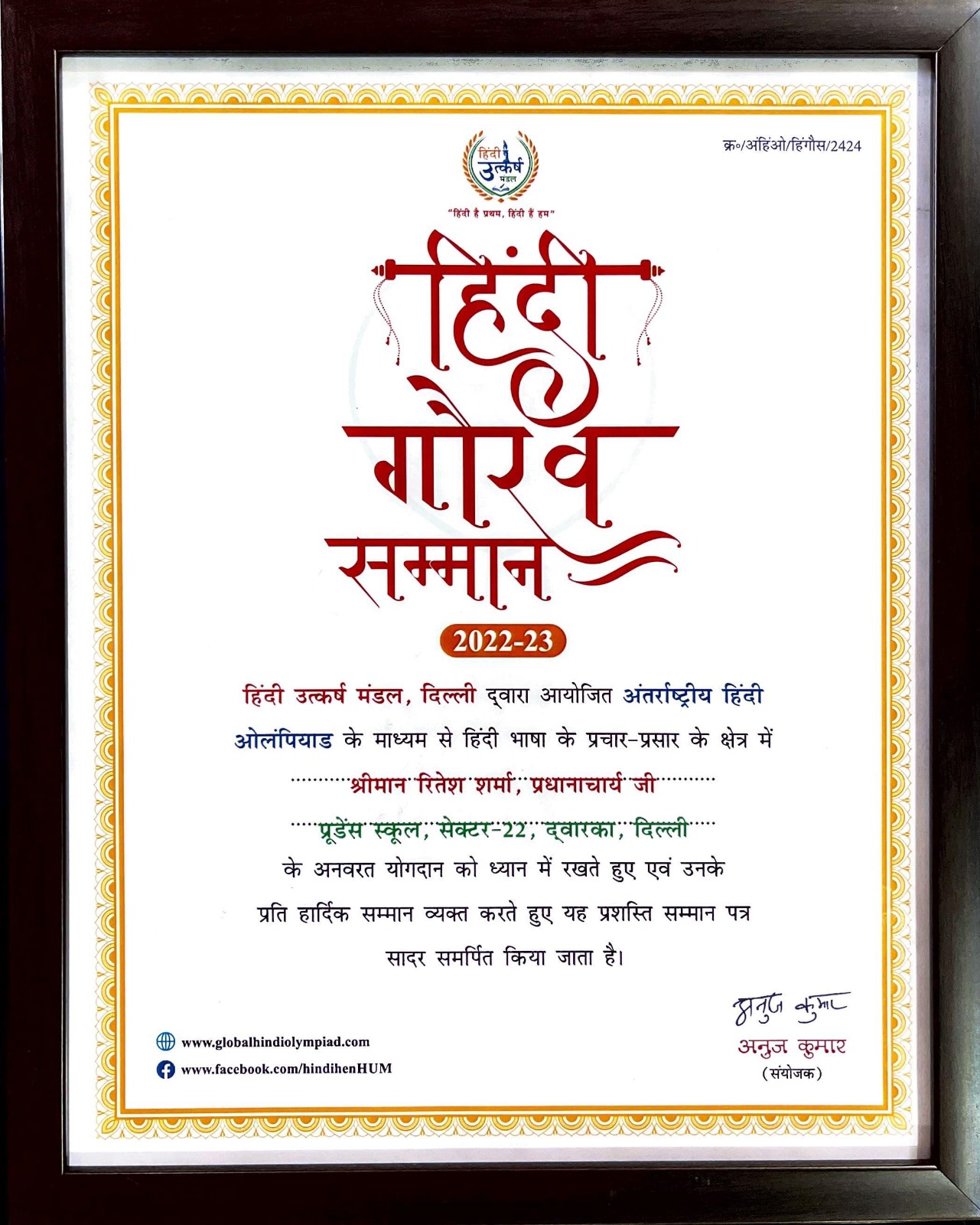 Mr. Ritesh Sharma, Principal of Prudence School, Sector-22, Dwarka, Delhi, is bestowed with a commen......
